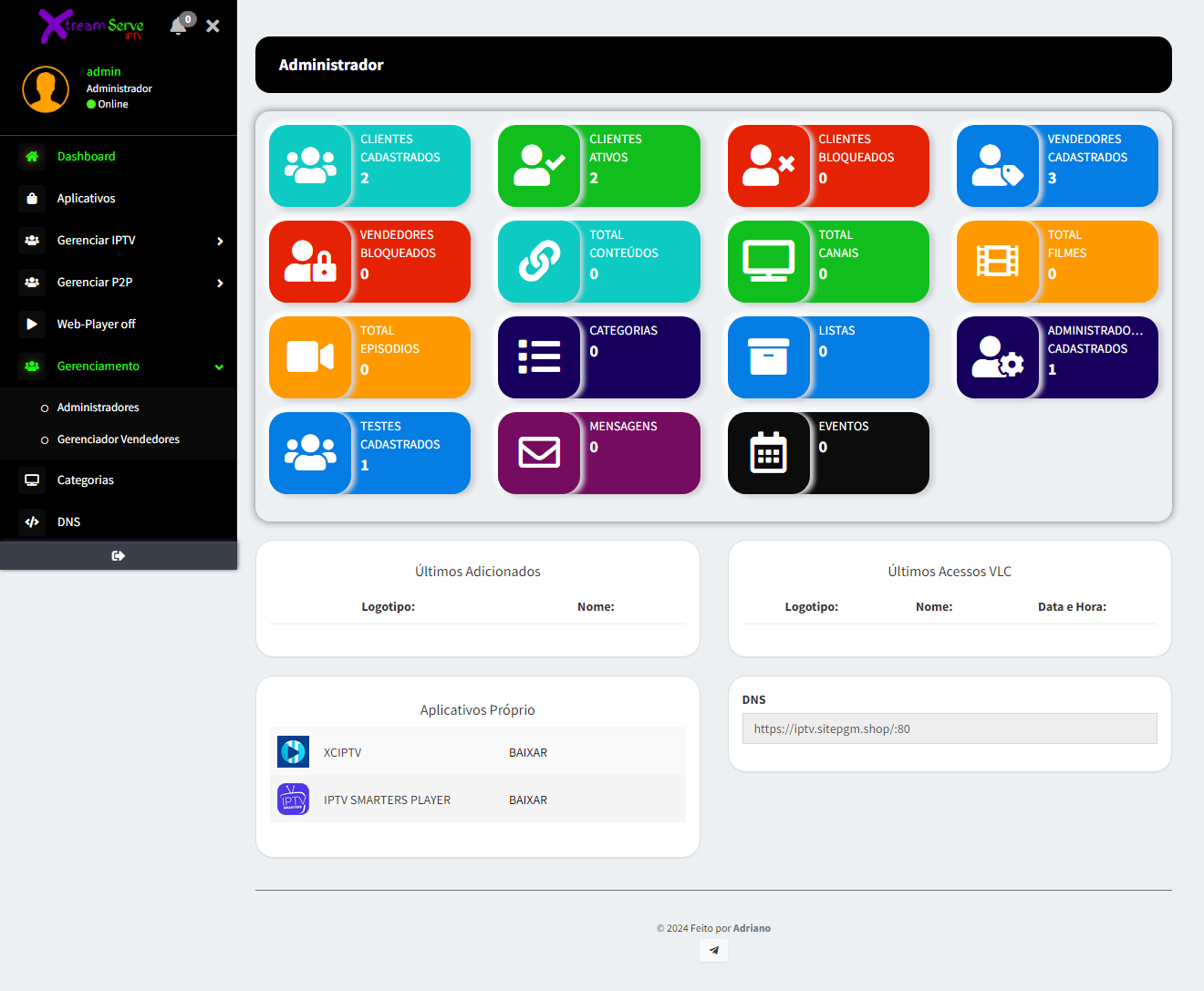 O que pode ser feito nele: Criar Pacotes variados, Inserir os Links dos Canais, Atribui o usuário a um pacote, inserir um revendedor, configuração de DNS, O usuário pode copiar o link do pacote de canais dele para importar no gerenciador de mídia, bloqueio e desbloqueio de usuários, ja vai incluso canais para testes!